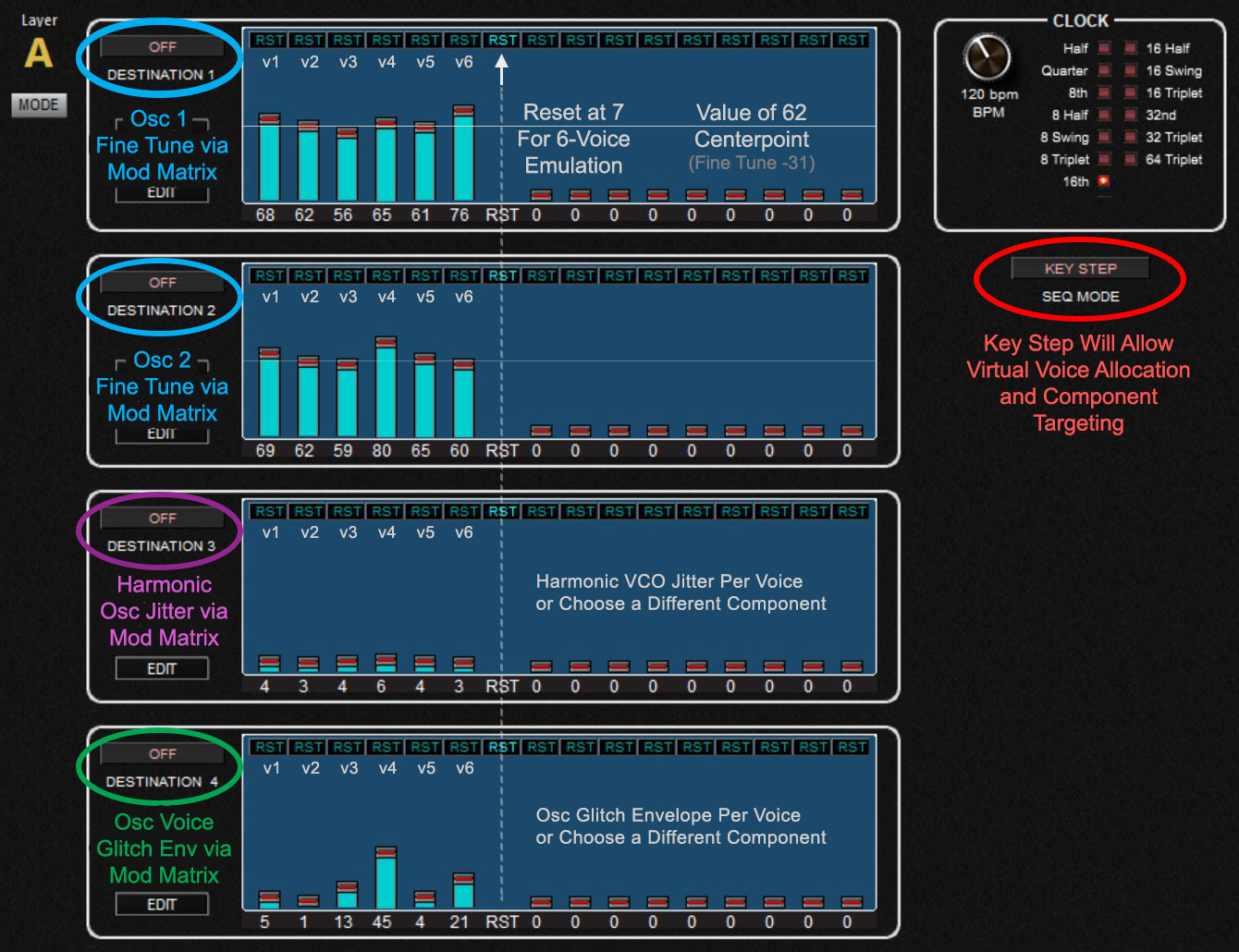 If you're trying to model a Prophet 5, set the reset at step six for all lanes. If you want to model a Memory Moog, set reset at step seven for all lanes, etc... You're virtually defining how voices will create repeated patterns of imperfection, like on the actual synths of yester-year.